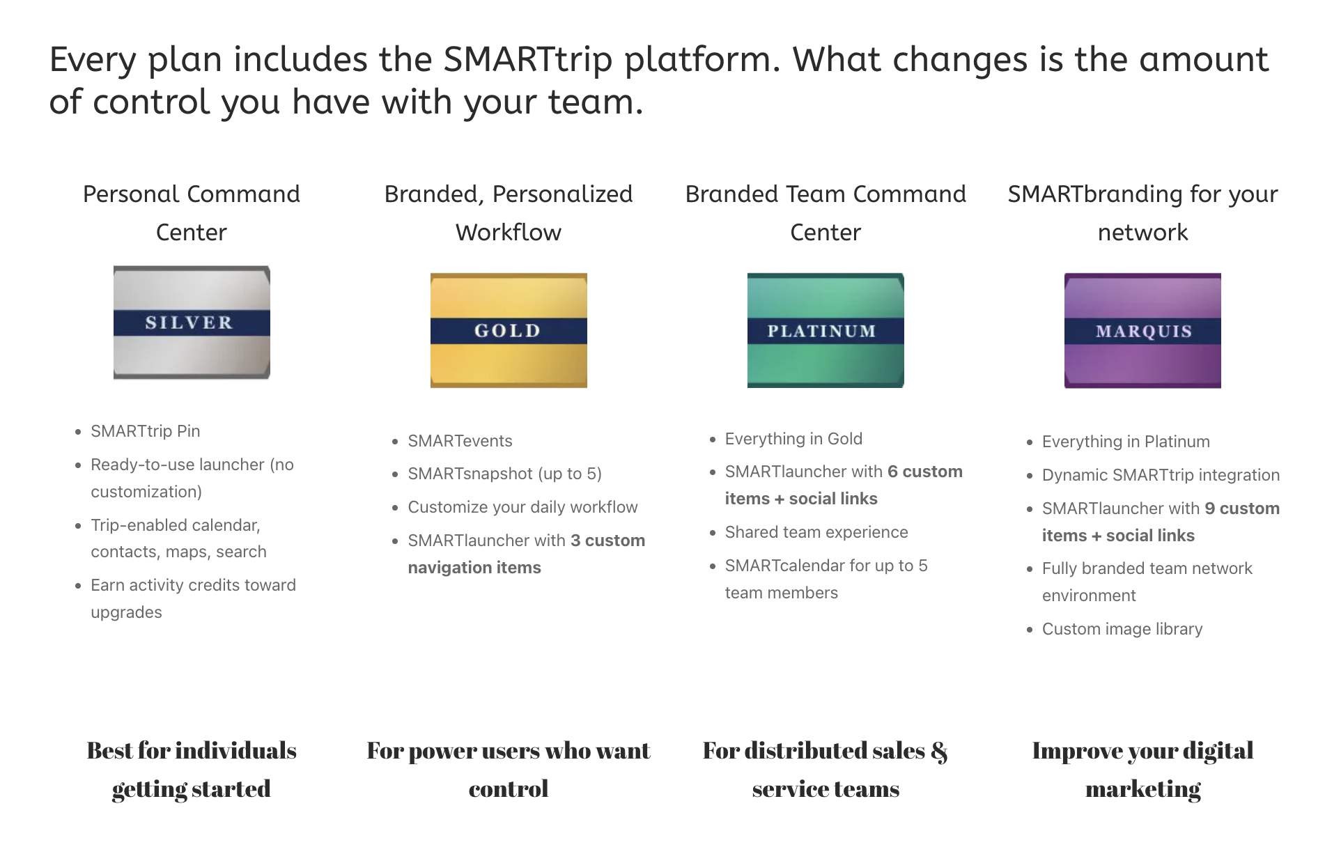 3. PLATINUM ($49/mo) this allows you to build and customize your own SMARTtrip tool, plus select 6 navigation items in your SMARTlanding tool. You will have all the benefits of GOLD, plus unlimited SMARTshapshots, our SMARTmap function and one SMARTcalendar license (launching in November). This also includes the ability to integrate our dynamic tools into your site or system.